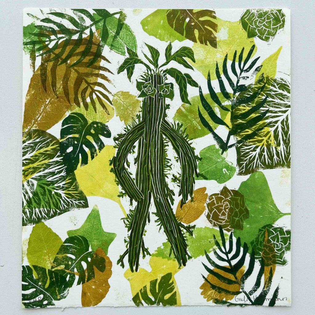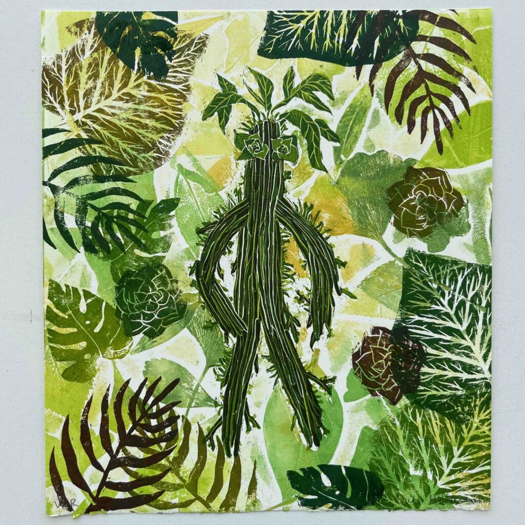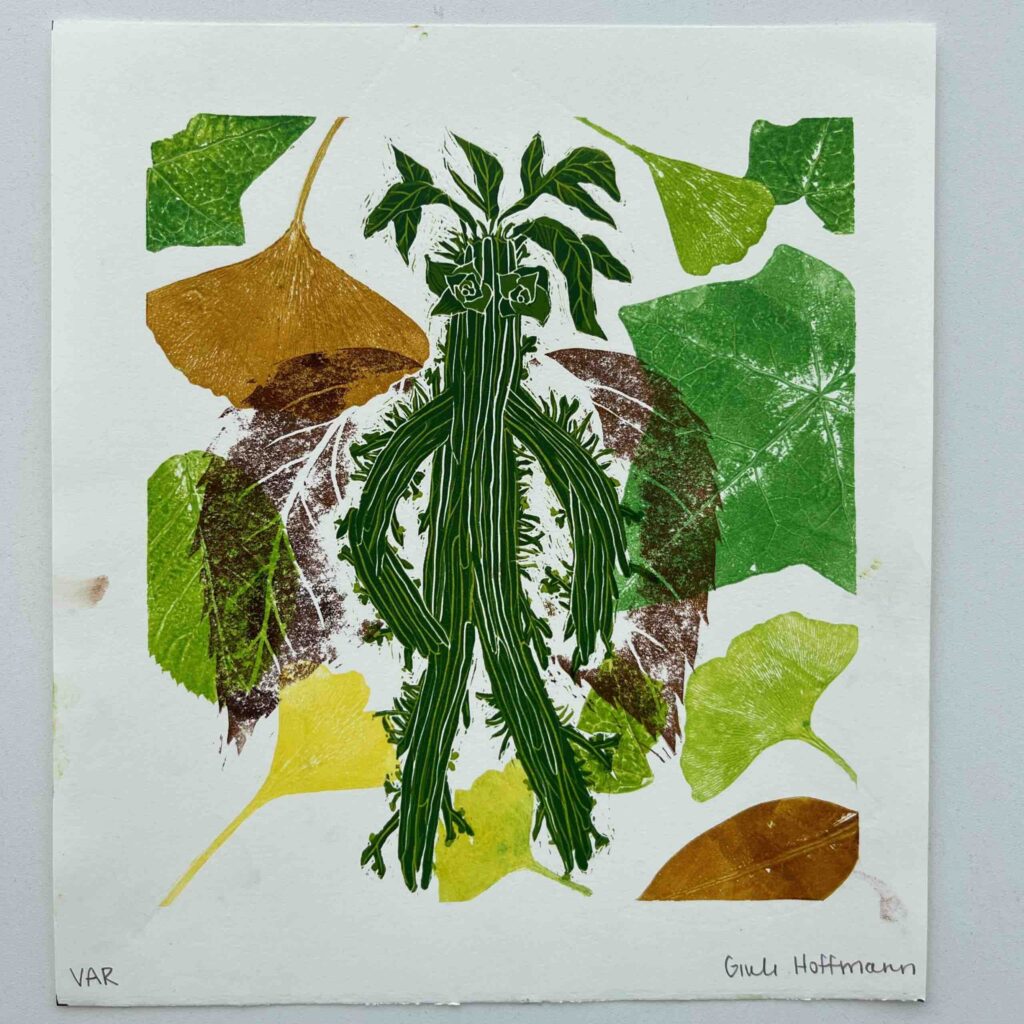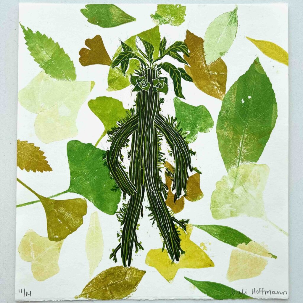 Media: Reduction linocut printing using a Vandercook letterpress machine (beast itself is 4 layers), ink-covered leaves rolled on paper
