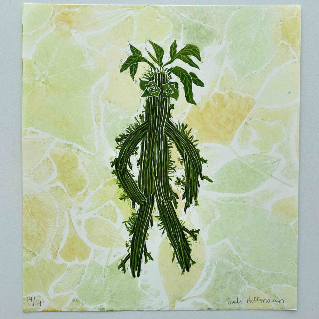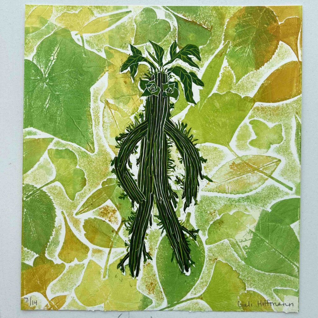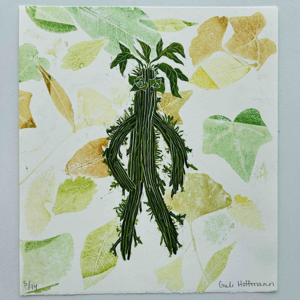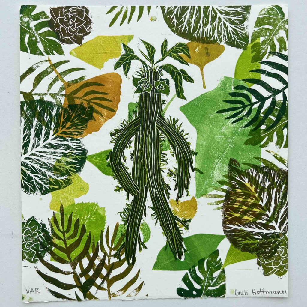 Media: Reduction linocut printing using a Vandercook letterpress machine (beast itself is 4 layers), ink-covered leaves rolled on paper