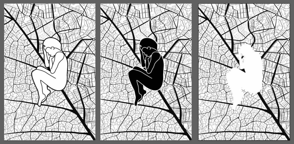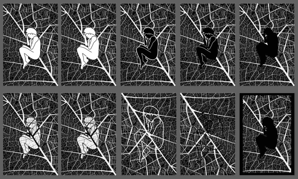 Artist Statement: “You Are Here” frames the veins of a single leaf against a street map to evoke the similarities between the smallest and largest systems of life, as well as the natural and man-made world. By existing between these boundaries, humanity is literally constrained by, but metaphysically exceeds both.