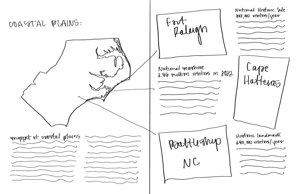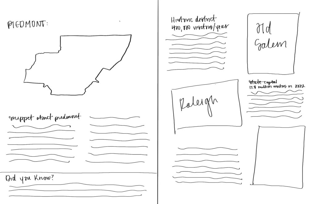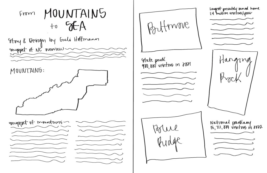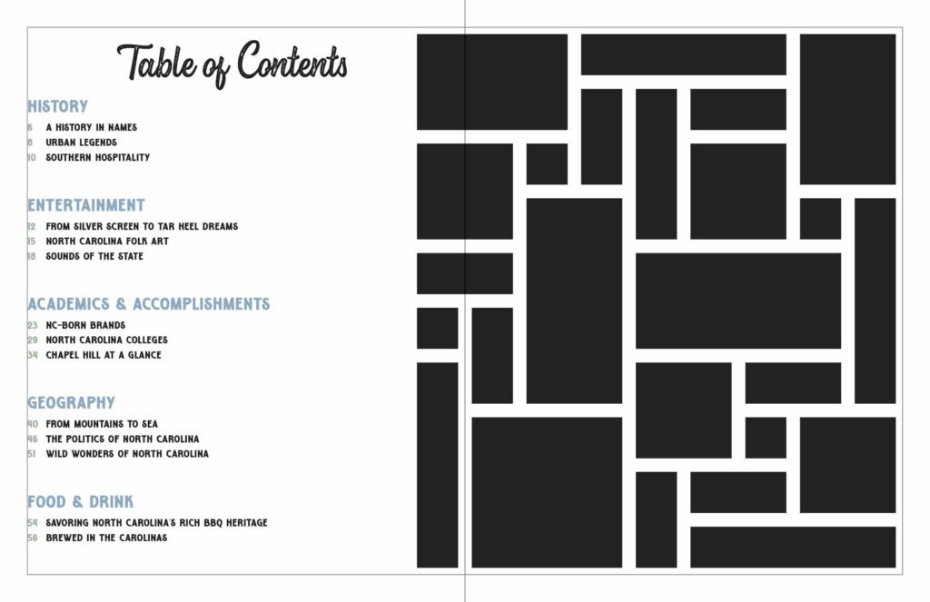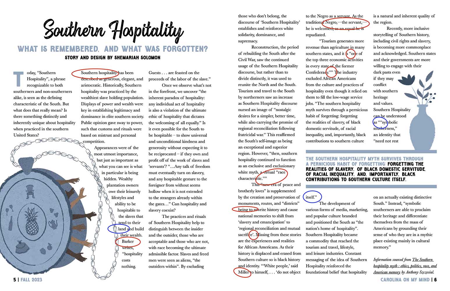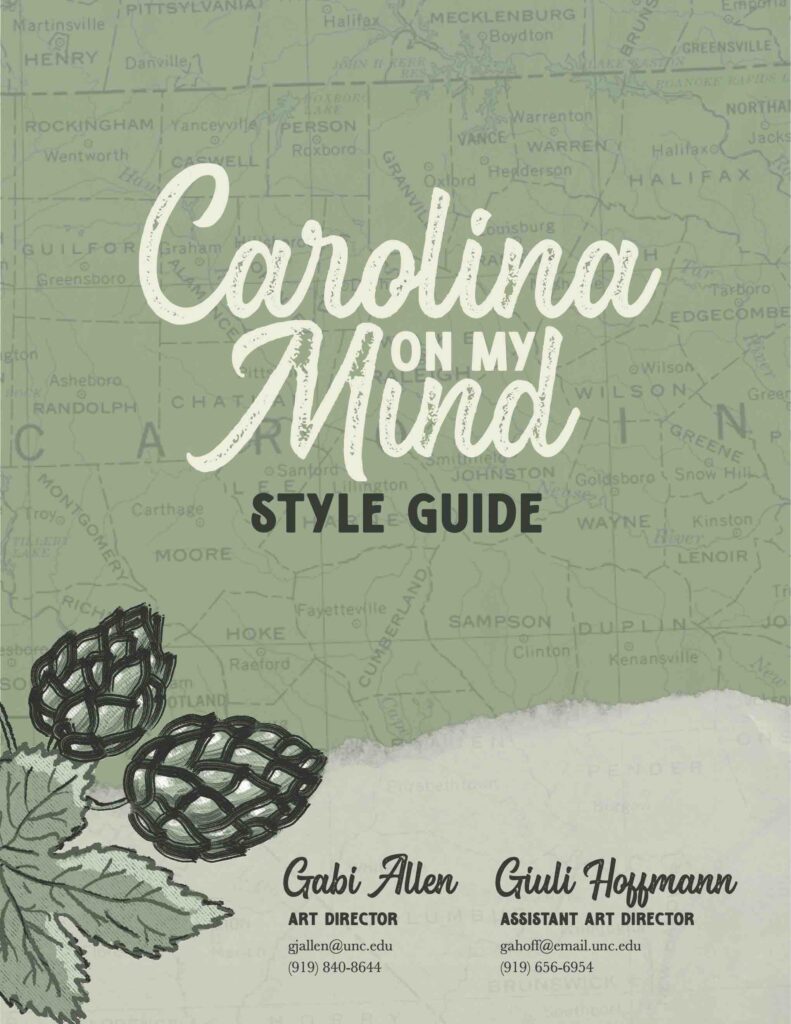For my magazine class, I was chosen as the assistant art director for one of our two magazines, which we made about North Carolina and titled “Carolina on My Mind.” The art director and I decided its mission and content, created a style guide, and managed 14 students’ work. The style guide included fonts, color schemes, tone words, layout, and overall design feel. We created a Pinterest board with examples of appropriate graphic styles for the other students to gain inspiration from, as well as provide shared folders with design assets like paper textures. The two of us were in charge of helping brainstorm and refine designs for our classmates’ articles, ensuring students turned in their work on time, providing 1-on-1 feedback for each student 2-4 times, making final copyedits to each of those revised drafts, and coordinating with our professor to determine individual grades.