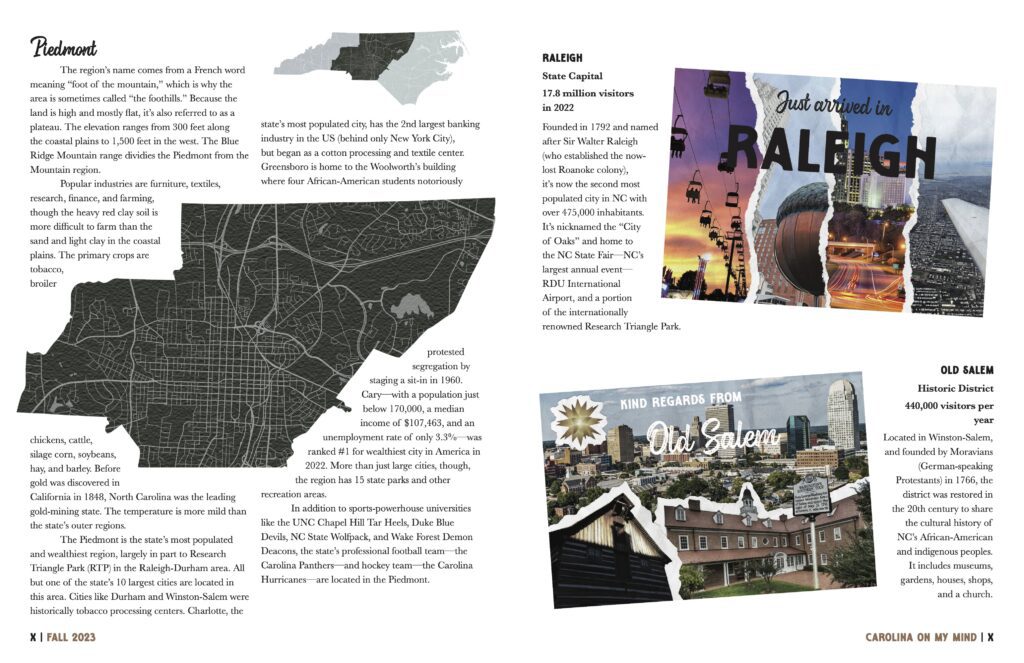 For my article, I chose to create a six-page well about the state’s geography, broken down by its three distinct regions. I created 6 unique “postcards,” combining about 50 individual photos either taken by myself or sourced from stock websites. I also designed the magazine’s Table of Contents spread, which features designs from 5 students’ articles.