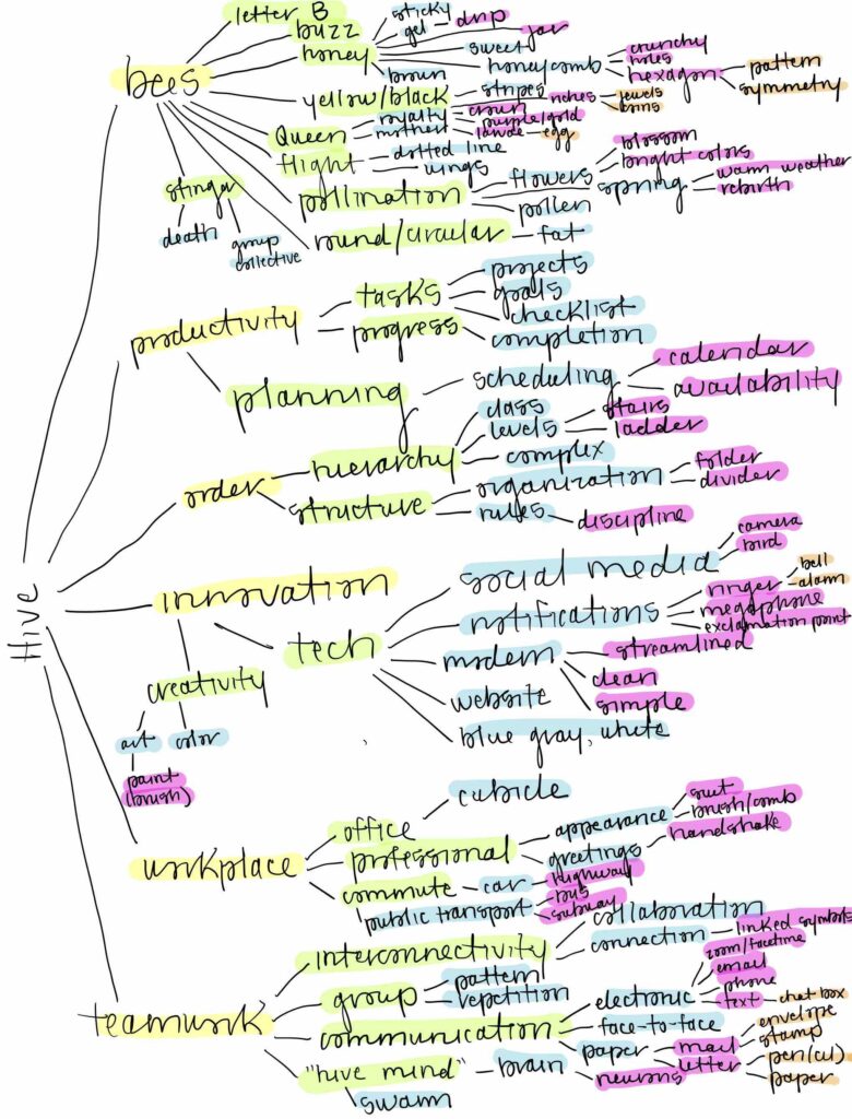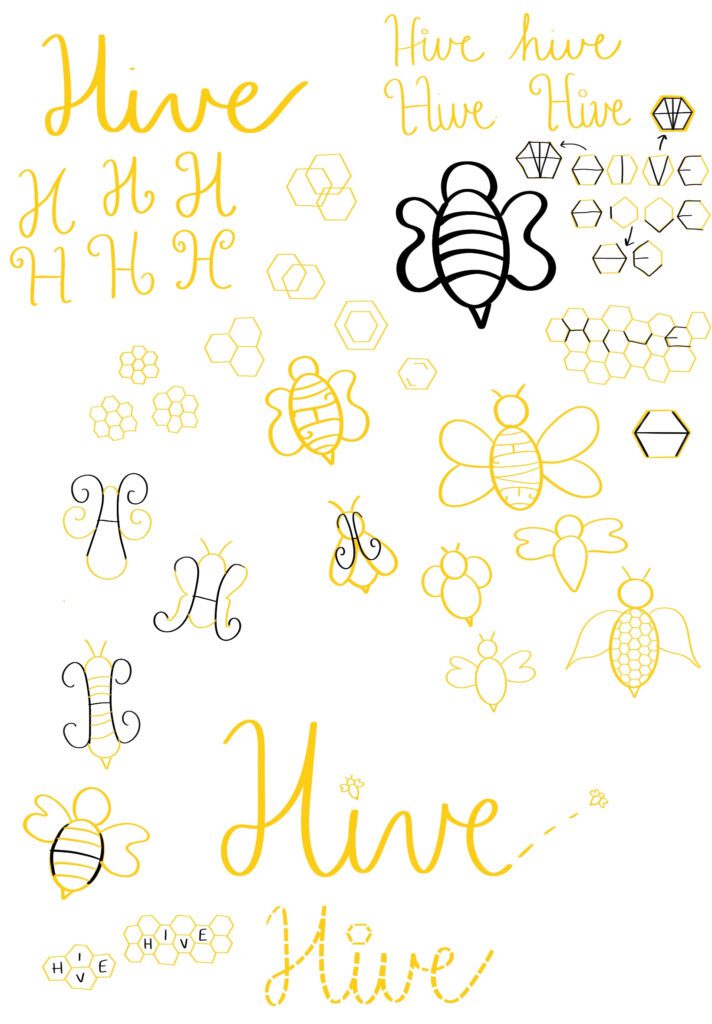 After doing my mind map (below), I knew I wanted to emphasize the bee imagery, but all my initial sketches felt much too cutesy, so I abandoned the bee shape itself. I really liked the idea of hiding the “H” from “Hive” in the logo somehow, which I played around with adding inside the bee’s body or even combining hexagonal-like letters into one single symbol. I soon turned to the honeycomb shape, because the geometry of the hexagon felt very technological, modern, and streamlined.