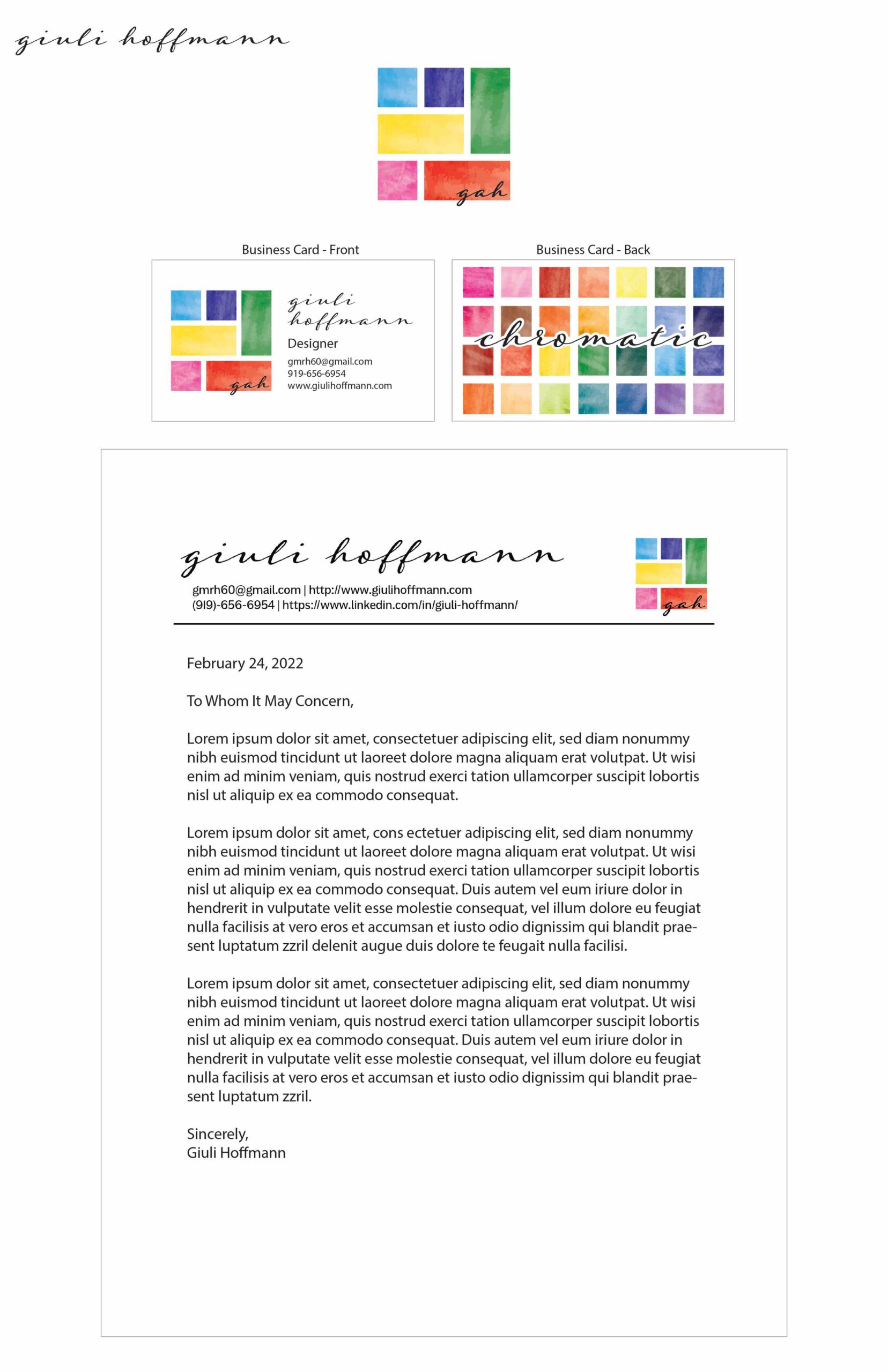 Prompt: In this project you will create the visual identity for you or for your own company using Illustrator. You will name it (you can use your name), design a logo, business card and invoice sheet. Pay attention to the use of typefaces and colors. Both the logo and the overall style choices should say something about yourself and your business. Your logo should represent some image/facet of yourself. I typically recommend you brand yourself, but you can create a name for your company if you’d like. You also need to include your contact information. The logo must include a simple VECTOR illustration as the symbol of yourself or your company.