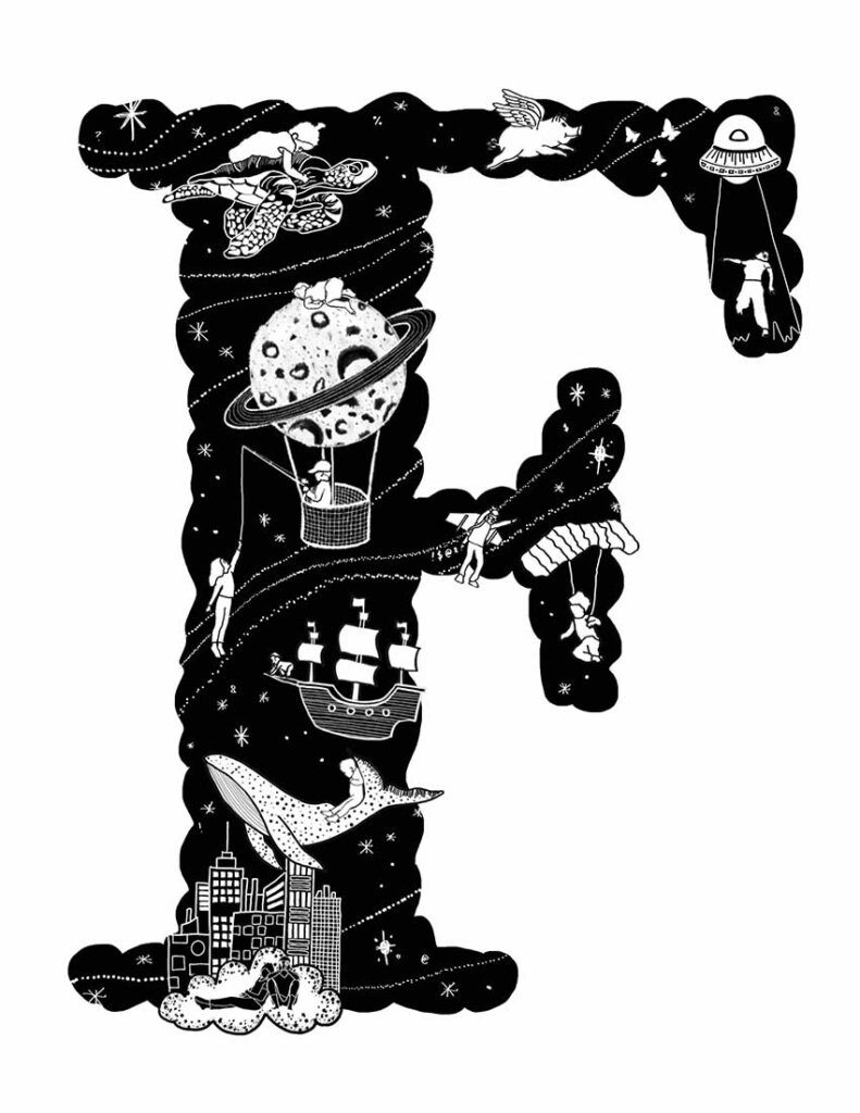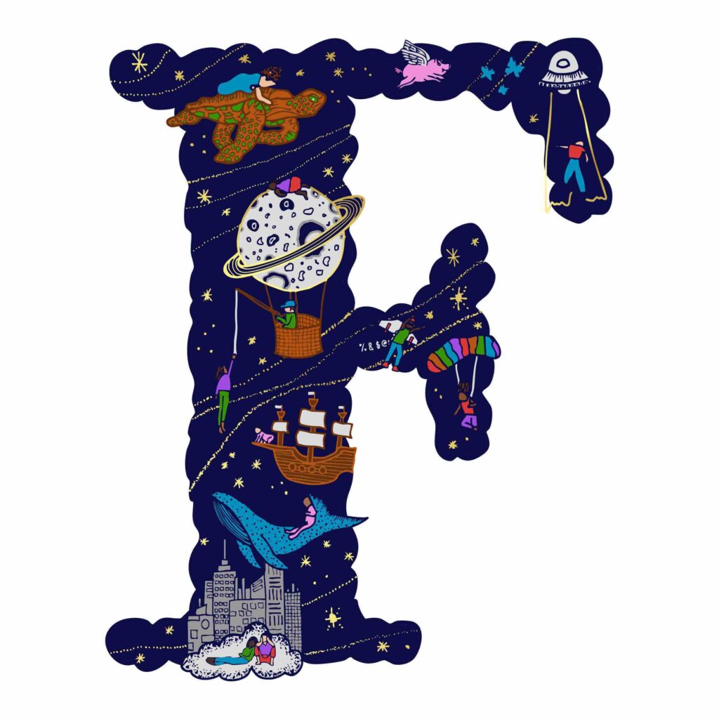 Since the book was banned due to its frequent expletives, I chose the letter “F”, inspired by the font family Bodoni and stylized to look like a cloud. Inside, children are performing fantastical–even dangerous–activities, rather than going to sleep.