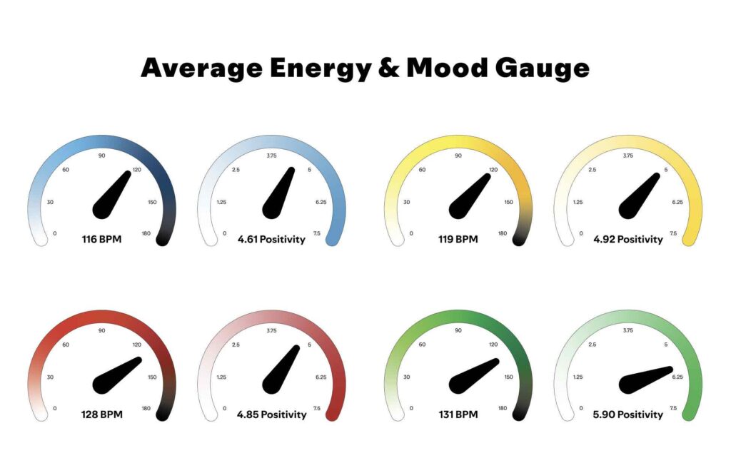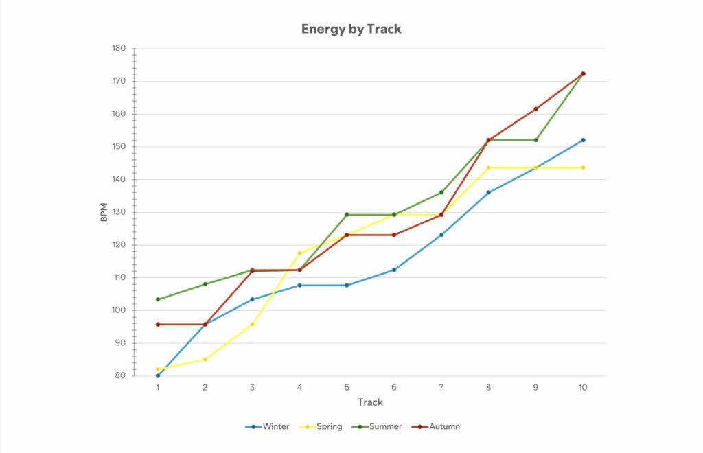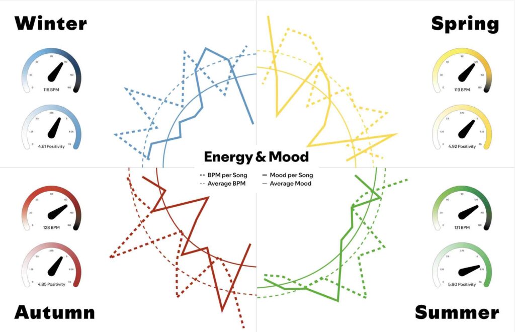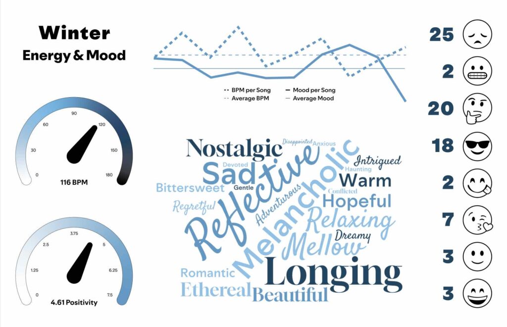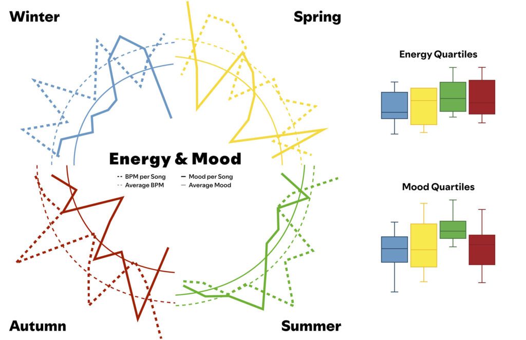 The average BPM per season, in order of lowest to highest, was Winter → Spring → Fall → Summer. Summer had the highest seasonal min BPM and highest seasonal max BPM, meaning it was the most consistently upbeat. The average mood per season, in order of lowest to highest, was Winter → Fall → Spring → Summer. Summer had the highest seasonal min mood and highest seasonal max mood, meaning it was the most consistently happy. Winter had the lowest seasonal min mood and lowest seasonal max mood, meaning it was the most consistently unhappy.