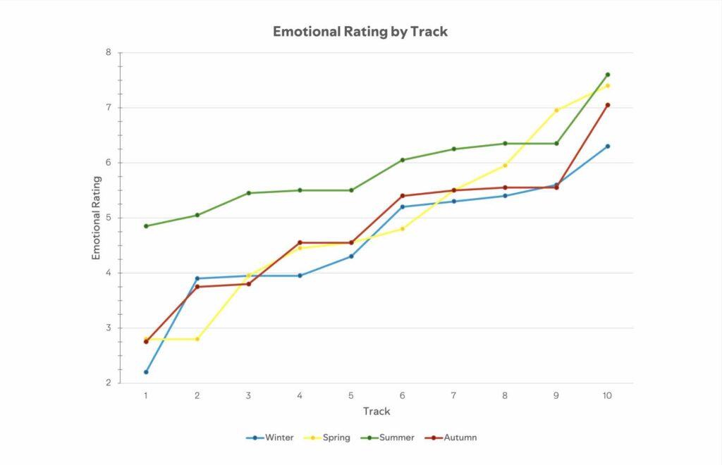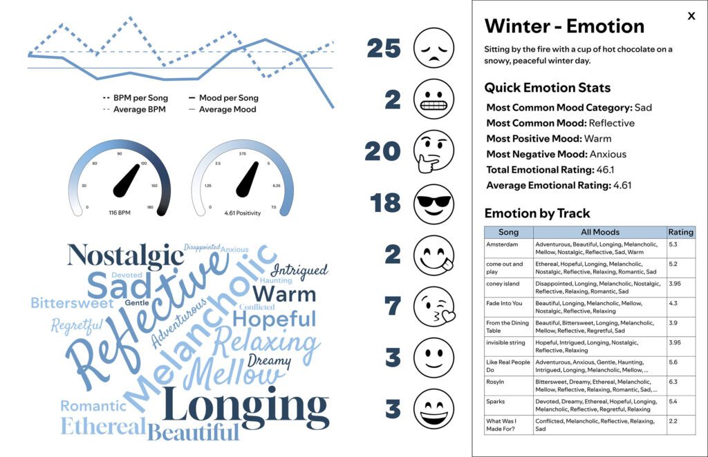 For the sad mood category, in order of highest to lowest counts of sadness, it was Winter → Fall → Spring → Summer, meaning Winter was the most consistently sad and Summer was the least consistently sad. For the introspective category, in order of highest to lowest counts of introspection, it was Winter → Fall / Spring (tied) → Summer. Introspection often arises during negative experiences because we want to understand and resolve discomfort, whereas when we’re happy, we rarely pause to question it. That said, these introspection results support my predictions for happiness.