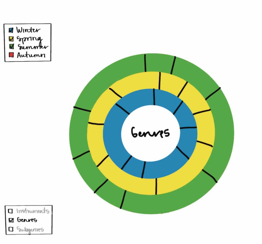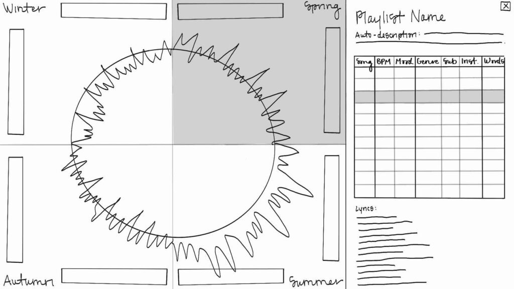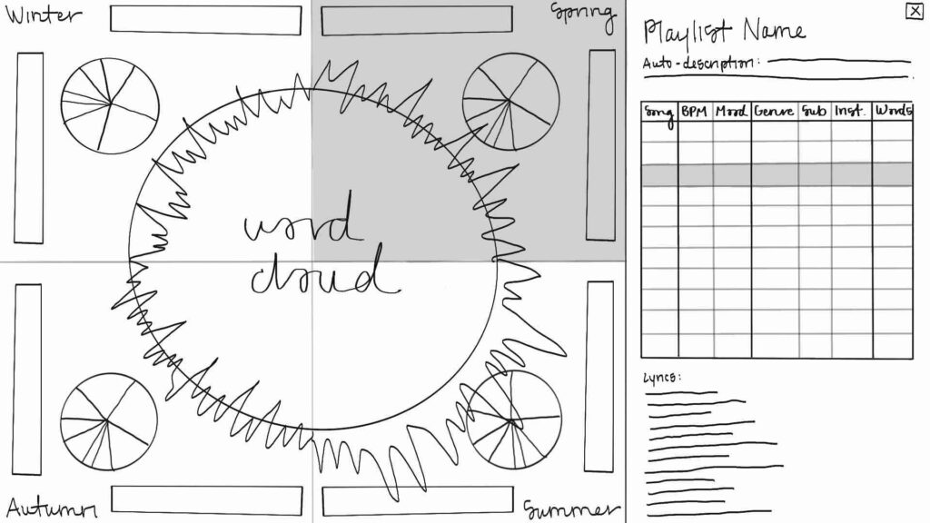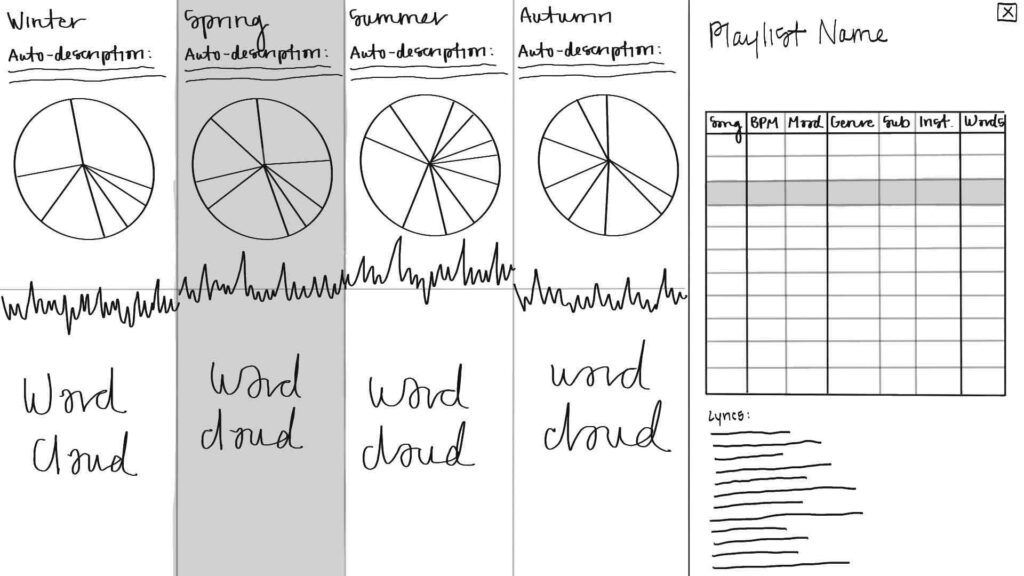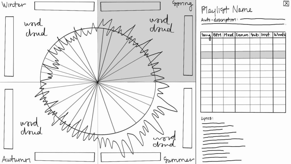 Originally, I wanted these visualizations to be interactive, coded, and mimic a platform in which other playlists could be analyzed, compared, and visualized. This is why my original sketches resemble multi-view dashboards. On the left side of the screen would be a color-coordinated, eye-catching visualization. There would be options for how many playlists and musical attributes to compare and display at once. Interacting with this side of the screen would affect the right side, which would have more “hard” data, such as an AI-generated description of the playlist, a table of songs and their musical attributes that could be filtered and sorted, and song lyrics.