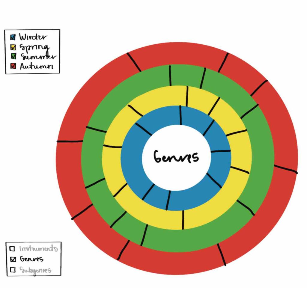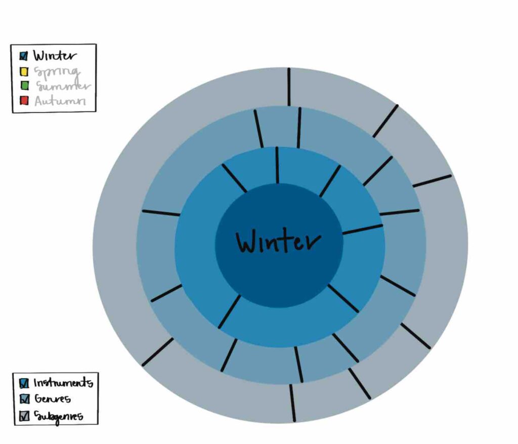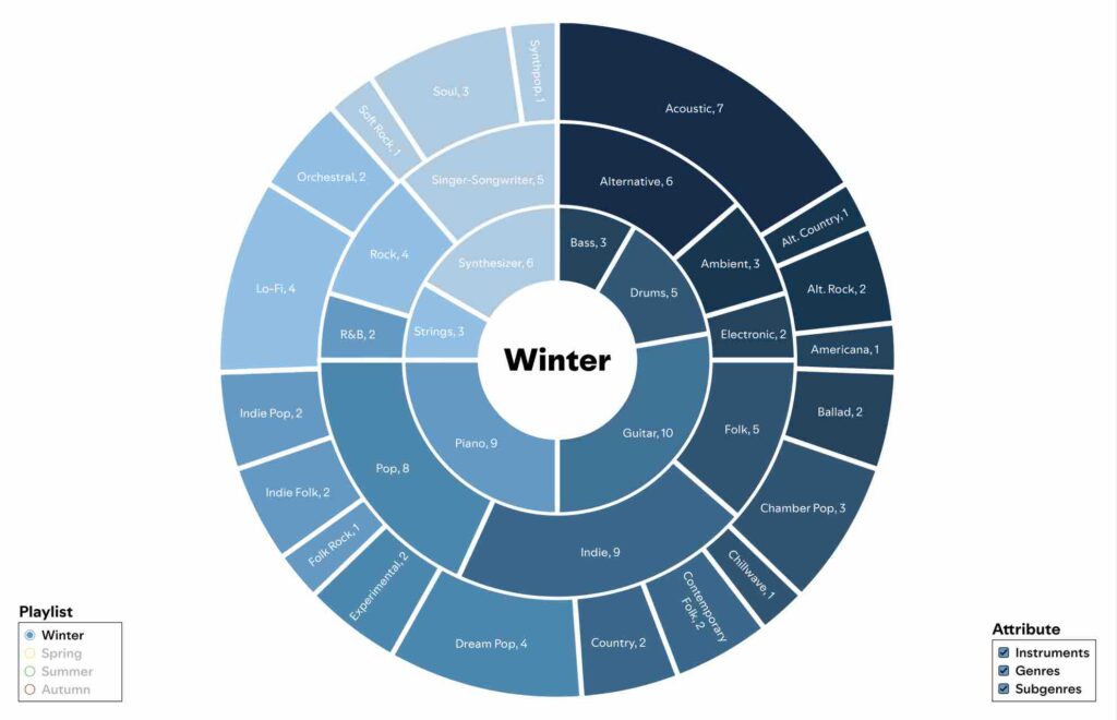 In regard to the sound categories—instruments, genres, and subgenres—summer was distinct from the three other seasons, but winter, spring, and autumn were not necessarily distinct from each other. Of the instruments, drum, bass, and synthesizer were favored in summer, while piano and strings were favored by the other seasons. Guitar was consistent across all seasons. Of the genres, electronic, hip-hop, and R&B were highly favored in the summer, while ambient, folk, and singer-songwriter were favored by the other seasons (summer had zero or only one instance for each of these). Indie, pop, and rock were fairly consistent across all seasons. Of the subgenres, dance, rap, and synth-pop were almost exclusively found in summer, while acoustic was the highest subgenre for all 3 other seasons. It was harder to compare any other subgenres besides these 4 due to the high number of subgenres and low number of songs per seasons.