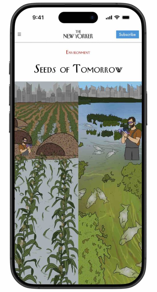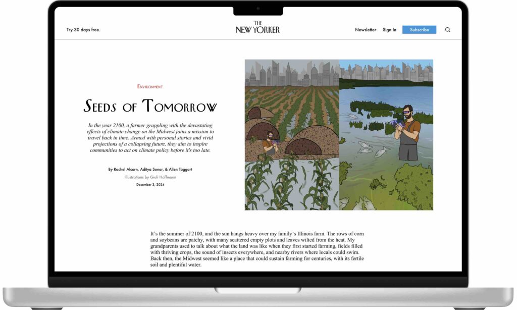 Beginning: In 2100, a farmer in Illinois reflects on the environmental challenges facing their generational family farm. Comparing their grandparents’ notebooks, they note dramatic changes in soil moisture, precipitation, and crop yields. One day, researchers who have invented time travel approach the farmer, seeking individuals on the frontlines of climate change to travel back to 2025 and share their experiences with communities across the U.S.