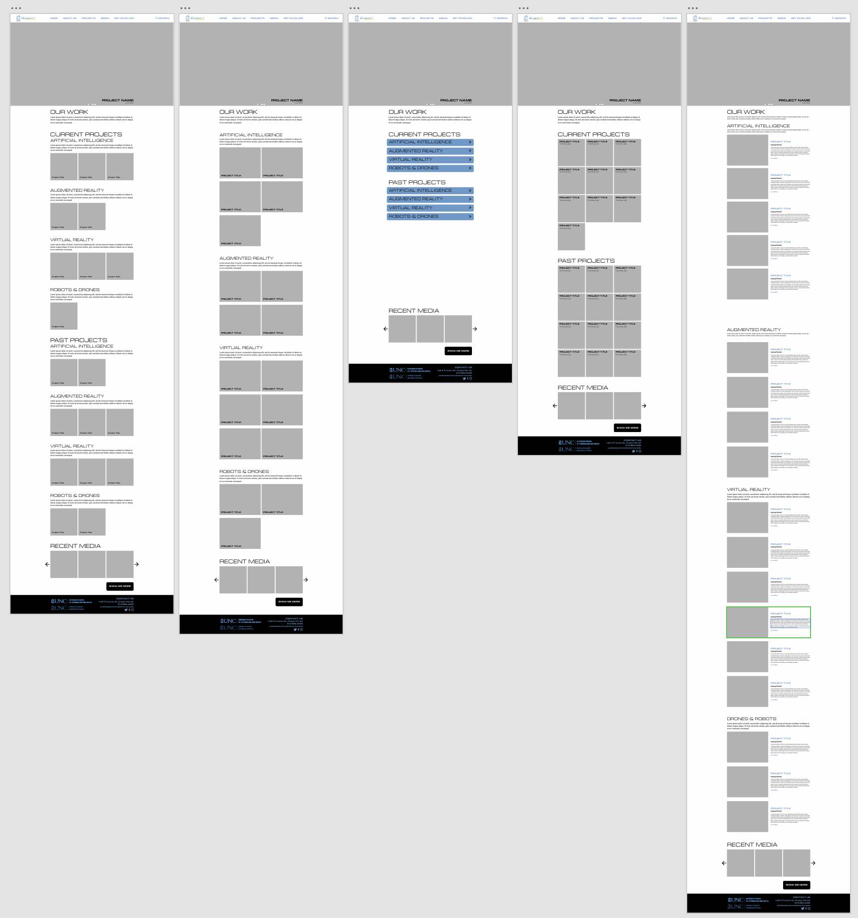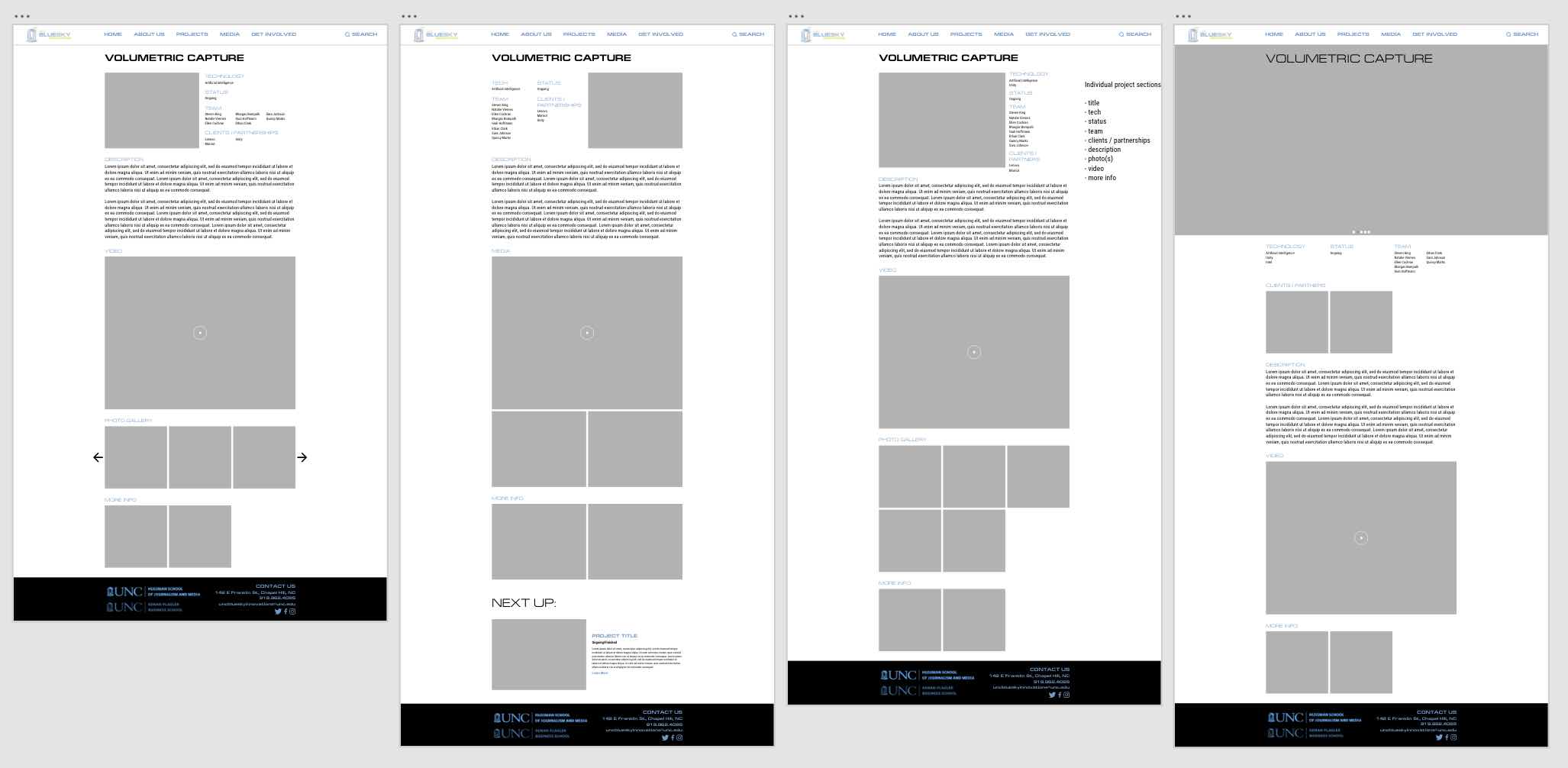 Project category pages were organized with “Current” projects appearing first, followed by “Past” projects. I used a two-column layout pairing images with short descriptions, allowing users to quickly scan and engage without needing to hover or click. On individual project pages, I broke from this format to avoid redundancy and better utilize space. Each project detail page began with a large splash image or carousel to immediately capture attention, followed by detailed descriptions and supporting content—such as videos, blog posts, or social embeds.