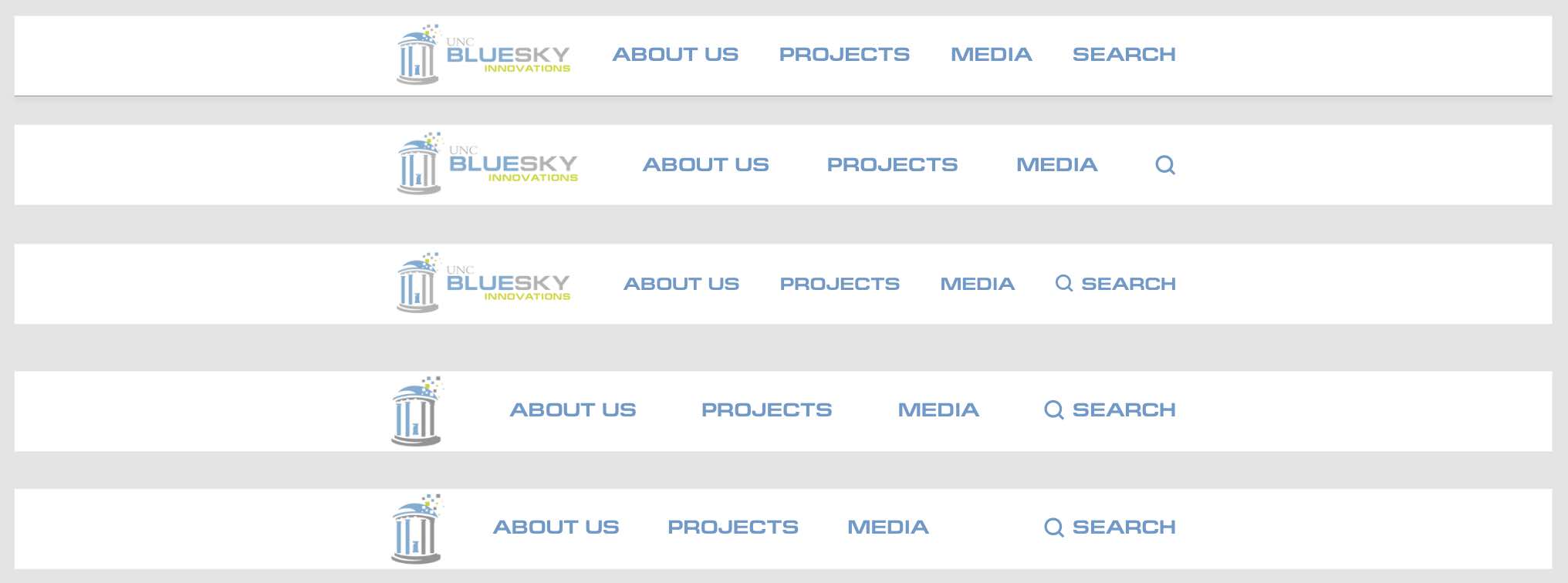 After reviewing several iterations, we ultimately chose option four, shown below. This version featured a clean, well-organized structure: the logo served as the “Home” link, followed by an “About Us” dropdown containing “DEI,” “Team,” “Events,” and “Contact.” The “Projects” menu included our four main project categories, while the “Media” dropdown housed links to the Blog, Videos, and Photos. We also added a search button for improved usability. This streamlined navigation bar was the version I implemented in the final mockup.