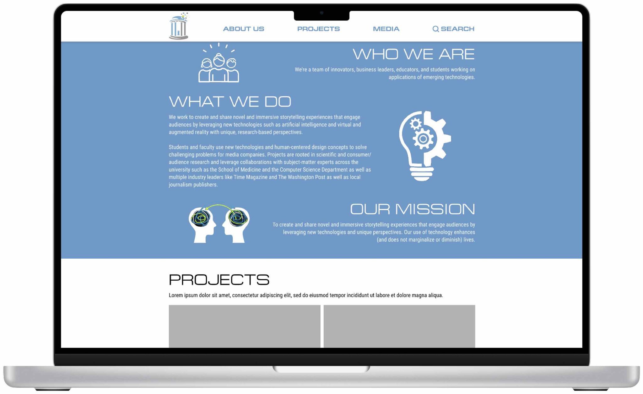 My final mockup—while slightly slow due to platform limitations—is fully functional and presents a reimagined vision for the site’s purpose and layout. Rather than treating the Home page as a basic introduction, I redesigned it to showcase the breadth and quality of our work. This included not only our in-house projects but also links to supplementary content such as blogs, explanatory videos, social media posts, and press coverage. Because the primary goal of the site was to generate excitement around our work—not necessarily to advertise services or attract new hires—this featured content was placed prominently at the top of the page.