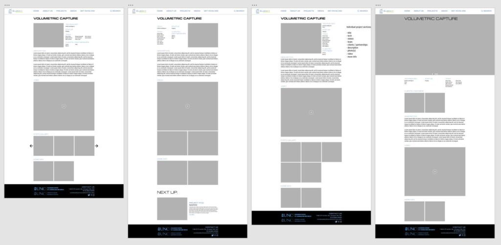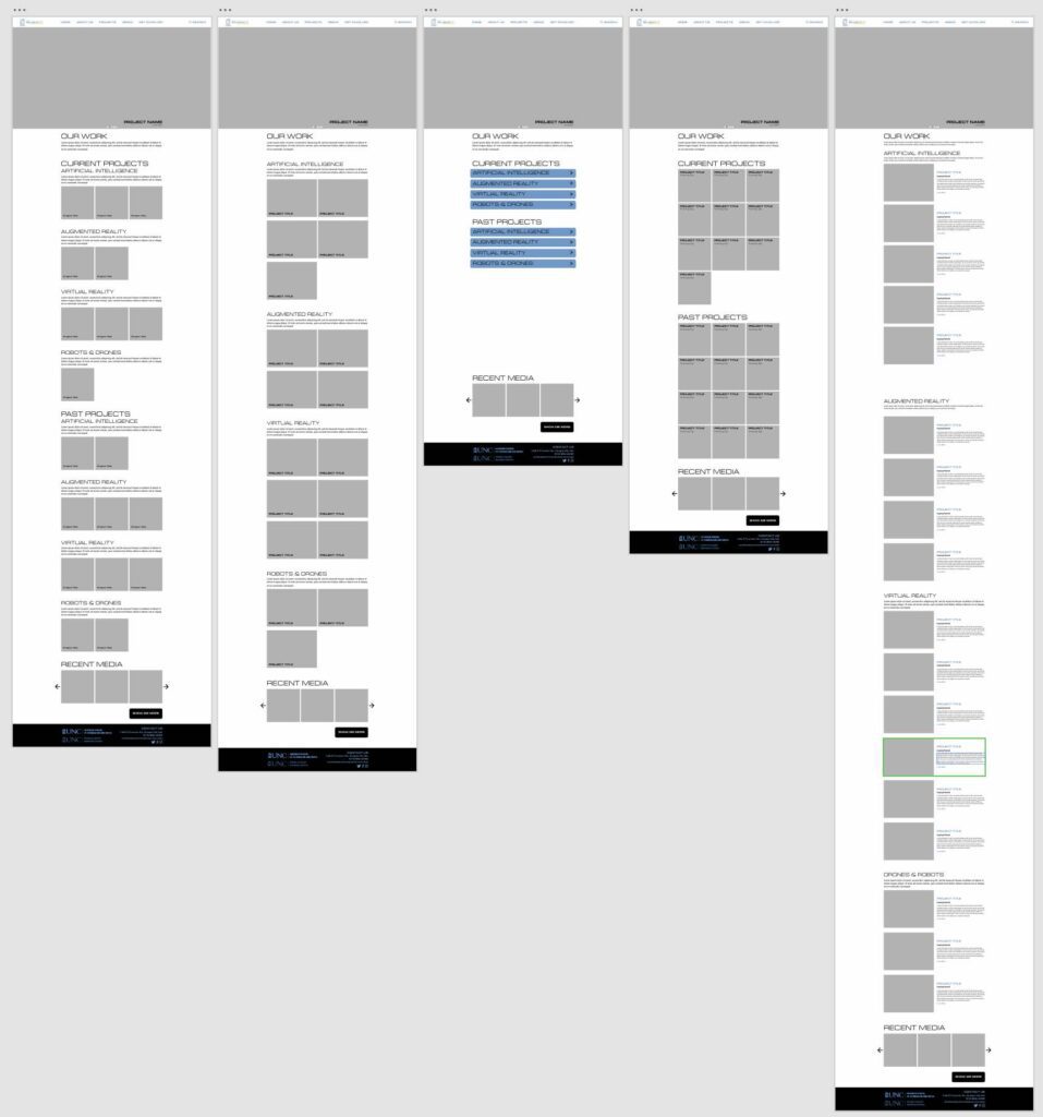 My final mockup—while slightly slow due to platform limitations—is fully functional and presents a reimagined vision for the site’s purpose and layout. Rather than treating the Home page as a basic introduction, I redesigned it to showcase the breadth and quality of our work. This included not only our in-house projects but also links to supplementary content such as blogs, explanatory videos, social media posts, and press coverage. Because the primary goal of the site was to generate excitement around our work—not necessarily to advertise services or attract new hires—this featured content was placed prominently at the top of the page.